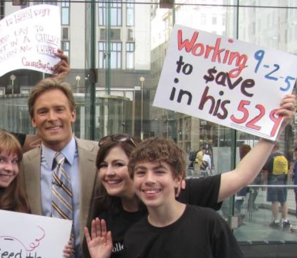 One of my many memories was from May 29, 2011, when I appeared with others in the audience of the CBS Early Show. As audience members, we were asked to bring homemade signs to catch the attention of one of the anchors for a potential opportunity to speak on-air about the cause that brought us there. The sign I created contained the words “Working 9-2- 5 to Save in his 529” and as you can see from the photo, it caught the attention of CBS weatherman Lonnie Quinn.